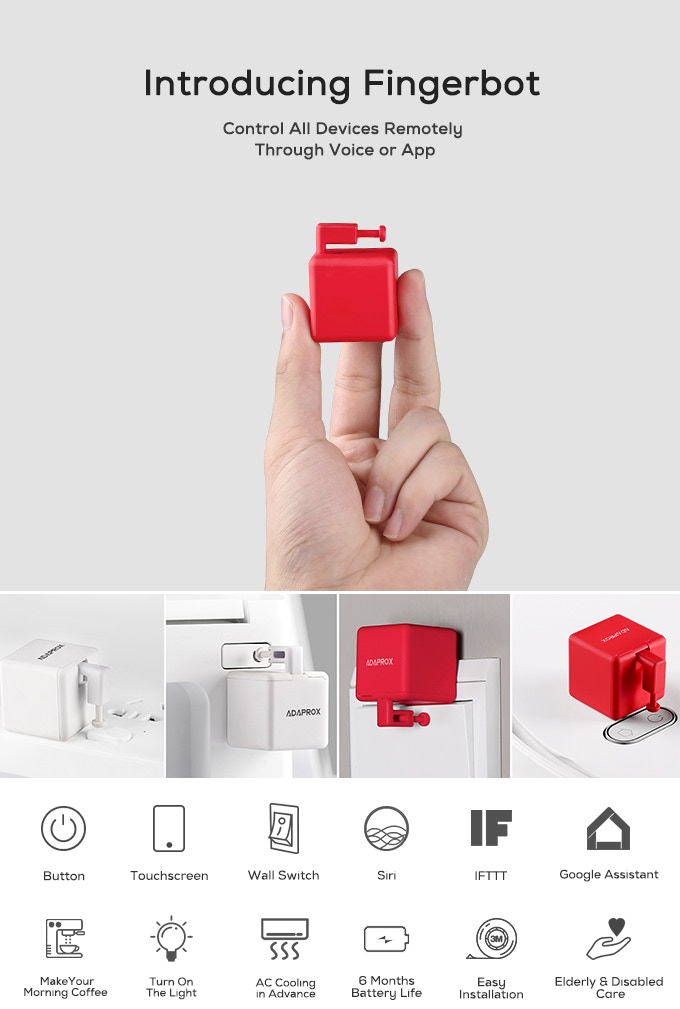 Устройство под названием Fingerbot должно заменить дорогостоящие и пока не всегда адаптированные для пользователя системы «умного» дома, говорят разработчики. Создатели проекта предлагают использовать небольшой куб со специальной кнопкой, которая будет нажимать все необходимые кнопки и выключатели в доме по первому требования владельца. Требование можно передать по голосовому помощнику или через аппку в смартфоне.